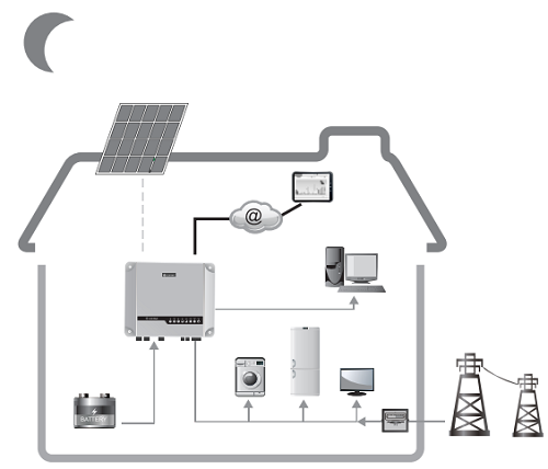夜晚,光伏侧直流停机,由储能电池通过储能逆变器单独给负载供电,当电池剩余容量(SOC)放到设定值,系统自动切入电网,由电网给负载供电,根据需求,电网可以通过储能逆变器给电池充电,也可以不充电;