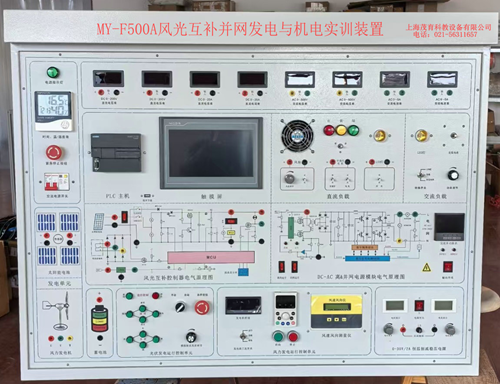 风光互补并网发电与机电实训装置-主要由风力发电机组、太阳能光伏电池组、控制器、蓄电池、逆变器、交流直流负载、开关控制模块、环境监测模块、仪表显示等部分组成,通过PLC控制、触摸屏和变频器作为控制核心,带有A/D、D/A模块、模拟量输入/输出模块、交流电机变频调速系统。系统于风能发电、光伏发电为一体的教学实训系统;各系统通过连接电缆进行连接,形成一套可完成风力及光伏发电、同步并网、离网电源的实验及教学演示。帮助学生理解太阳能并网、离网及风力发电系统的原理,从而起到学习工程实际应用技能的作用。