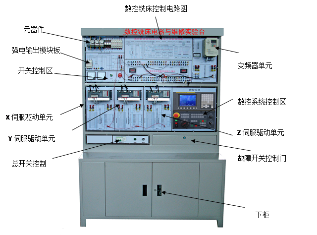 数控铣床电气控制与维修实训台可以使学生掌握数控铣床系统控制原理、电气设计方法、元器件的选择、铣床电气安装及调试、故障诊断维修、零件程序编制及图形模拟加工过程等多项实验内容,达到工业生产现场实习效果。该装置采用开放式结构、模块化设计,既可用于教学、也可用于课程设计、毕业设计和实训,有利于提高学生设计数控机床电气控制系统、诊断数控设备故障的能力,使受训对象最大限度地适应和满足市场需求。该装置也可以帮助科研技术人员进一步了解数控车床结构。