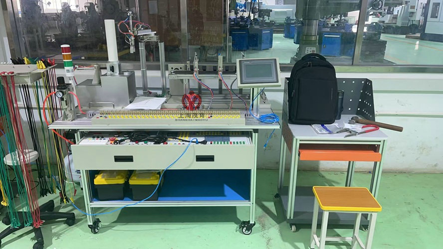 实训装置台架为铝合金导轨式,PLC 模块的 I/O 端子、变频器的接线端子及各常用模块与 PLC 的连接端子,均与安全插座连接,使用带安全插头的导线进行电路连接;而各指令开关、光电开关、传感器和指示元件的电路,则通过端子排进行连接。这种 “插拔线连接 + 端子排连接” 的组合方式,既能让学生通过插拔线熟悉电路连接的基本技能,又能通过端子排保障电路连接的快速、安全与可靠,实现 “技能训练” 与 “安全保障” 的双重目标。