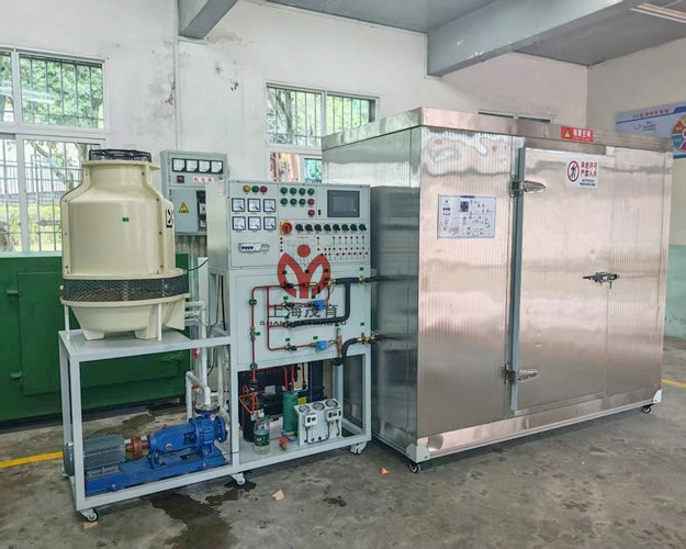 实训装置主要由控制柜、水冷制冷机组、高温拼装式冷库,低温拼装式冷库、主机实训模块、连轴式冷却水泵,冷却塔,温度和压力传感器等组成。