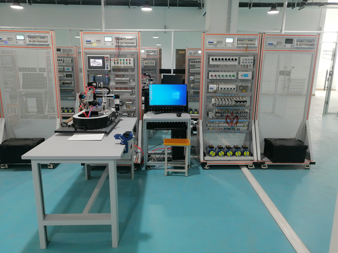 | 1 | 主体平台 | 1.尺寸:W8*D7*H183mm 2.平台采用立式结构开放式设计,主体采用4*8型材做骨架,周边采用Q235冷扎钢板做封板,表面静电喷塑处理,整机既坚固耐用,又美观大方。底部装有带脚垫万向轮,万向轮移动时用,可调脚固定时用,移动固定两相宜。顶部安装电源模块,中部为实训区域,依据任务安装不同挂板。 |