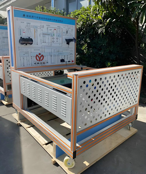 铁锂动力电池包及管理系统(带CAN通讯,含20单体电池,总正继电器,总负继电器,充电继电器,预充电阻,电流传感器,维修开关,高压保险丝,充电接口,放电接口,低压控制接口,动力电池采集模块,BMS电池管理系统主控模块,7寸液晶显示屏)、驱动电机及运行部分、VCU整车控制器、高压配电箱、电子油门总成、换挡机构总成、仪表(带CAN通讯)、变速箱、(左)传动轴、(左)前轮液压碟刹机构,助力器带泵总成,真空泵总成、电动真空助力刹车系统、真空压力传感器、真空罐总成、国标充电插口与充电枪、车载充电机(带CAN通讯)、DC-DC模块、故障设置系统、辅助蓄电池(12V45AH)、蓄电池断电开关、急停开关、上位机软件及数据线(检测VCU、车载充电机、电机与电池控制单元系统)、一体化全铝合金型材搭建的移动台架(1640×1300×1750mm ,带自锁脚轮装置,带安装检测端子的原理面板1248×898mm)、故障考核系统、设备操作说明书。